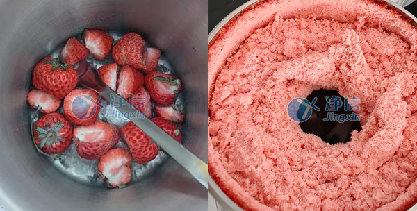 3、將液氮凍好的草莓放入勻漿罐中,將蓋子壓上。